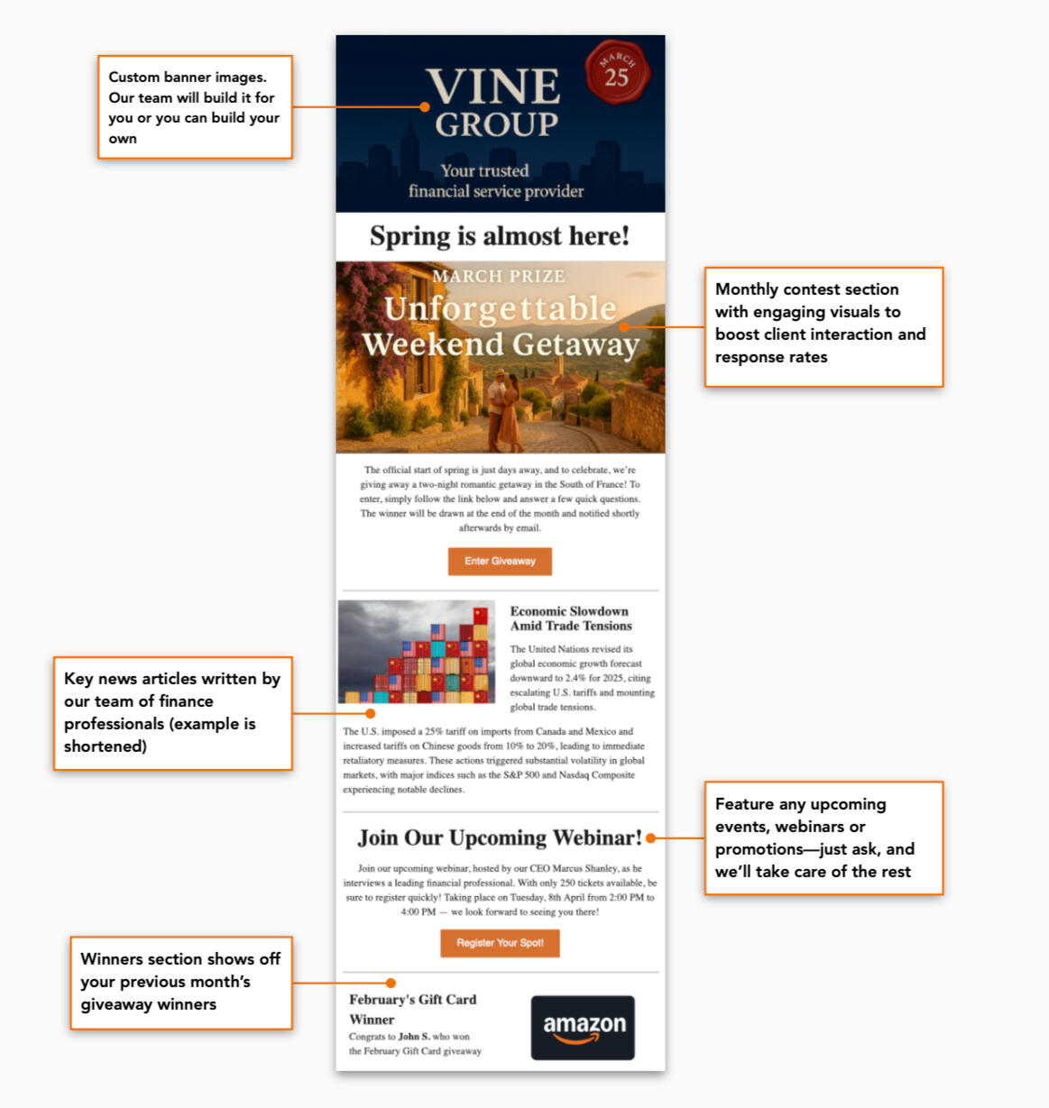 Enjoy not having to think about creating content on a monthly basis. We make sure each article is current with market trends.